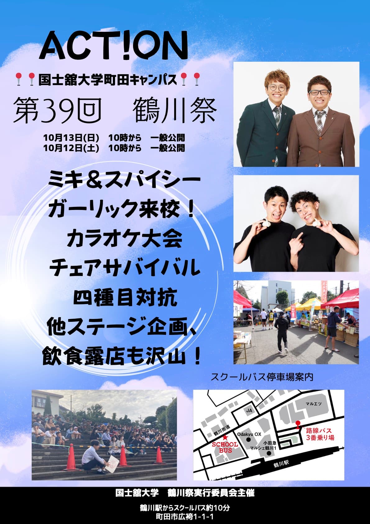 第39回の鶴川祭のテーマは『ACT!ON』に決まりました。ACT!ONは『ACTION』と『ACT ON』の二つの言葉を合わせています。ACTINには行動、活動という意味があり、自発的に動き出すや、より活動的な鶴川祭を目指すという意味合いを込めてつけました。ACT ONには実行するという意味と「〜に基づいて行動する」という意味があります。過去の先輩方が代々繋いできてくれたものに基づきつつ、新しいアイディアも取り入れ例年を越す鶴川祭にするといった意味を込めています。