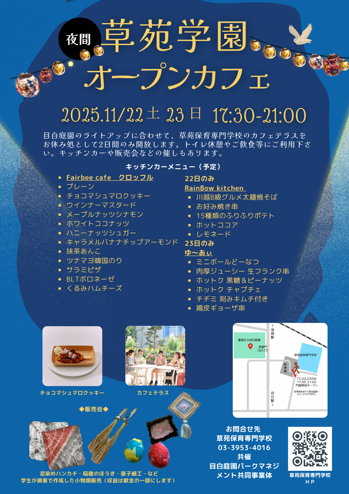 目白庭園でのライトアップイベントに合わせ、駐車場を挟んだところに位置する学校法人草苑学園 草苑保育専門学校が開催するオープンカフェにて出店いたします。